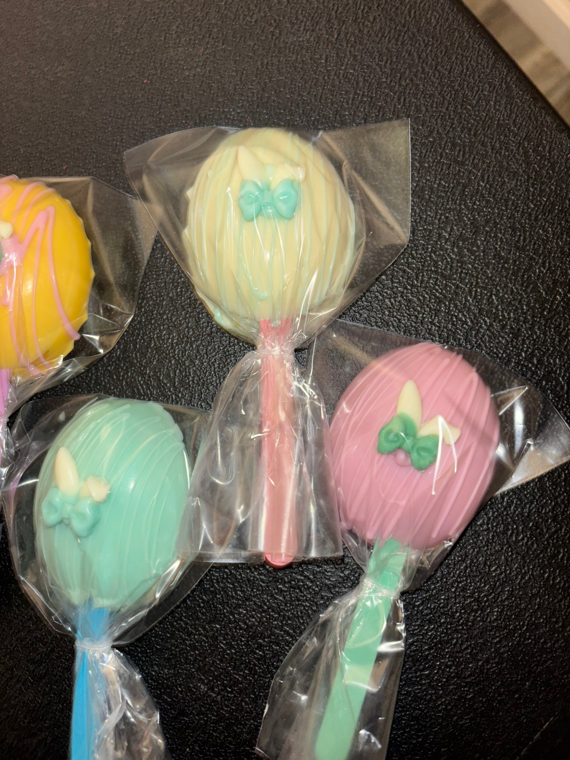 Cakesicles coated in chocolate and decorated. Cakesicles are available in 3, 6, or 12.