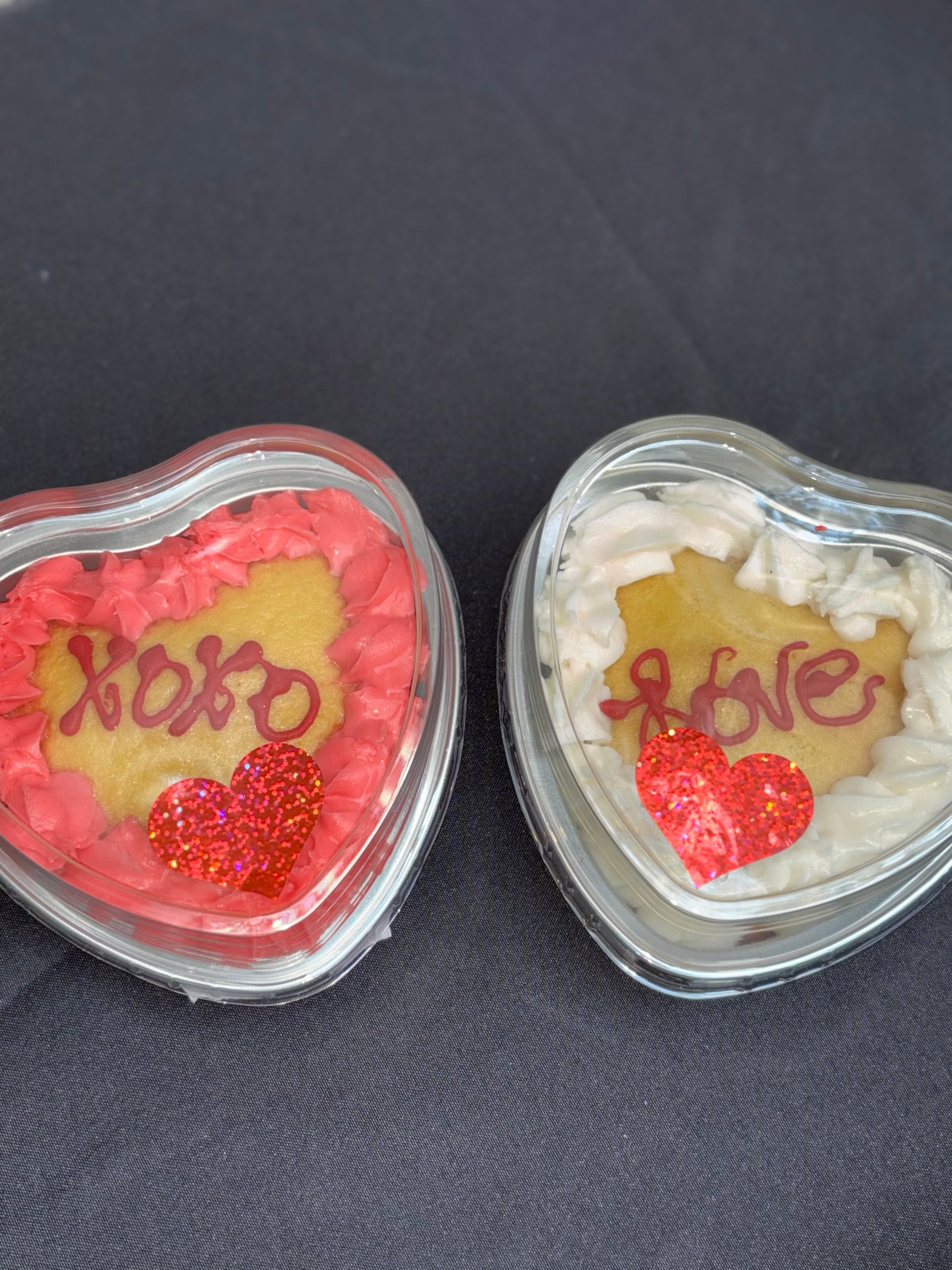 Two-layer round or quarter sheet cake, freshly made and packaged to order. Customization and decoration available, though limited.